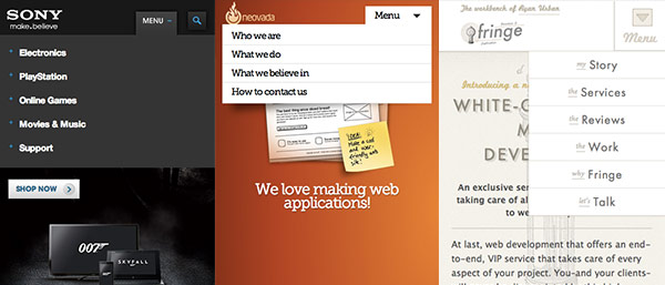 Creating a small-scale site is the simplest solution. Play with the CSS to make sure the navigation menu fits perfectly in small screen. This solution works most effectively with a limited number of navigation items. If your navigation menu has more than four items, this is a not a particularly viable option. However, some users may find it hard to read and difficult to tap on the link correctly.