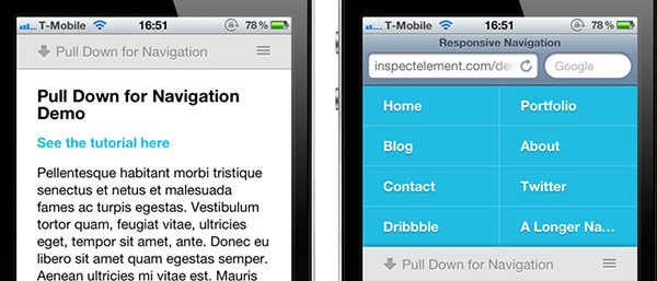 Using the concept of "pull down to refresh," the Pull Down experimental mobile navigation menu replaces a UI element with a natural gesture. You can view this implementation from Inspect Element.