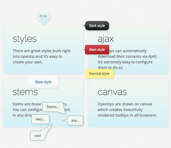 Opentip is a open source javascript tooltip framework created by Matias Meno. By utilising canvas, tooltip can be rendered easily with different styles. Also, for those who are not familiar with Javascript, you can create tooltip easily by using HTML data attributes. Opentip supports most browsers including IE7+.