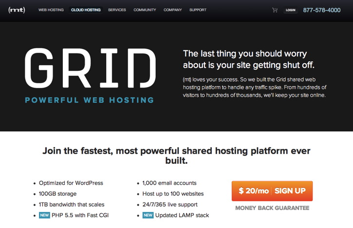 Media Temple introduces a Grid plan with 1 TB scalable bandwidth and 100 GB storage, where you can host up to 100 websites, which are optimized and protected against spam or hack attacks through the Cloudmark system, and CloudFlare with Railgun. And you save loads of money, because the Cloudflare with Railgun would normally cost you $200, and Media Temple will get it for you free of charge.