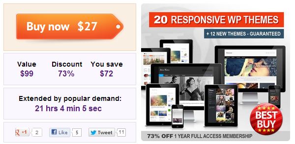 This beautiful collection of 20 responsive WordPress Themes, plus a guaranteed minimum of 12 new WordPress themes over the next year, normally would cost $99 for a Personal license, but for a limited time only, you can get them all with a 1-year Personal license Club Membership at WPtriumph for just $27! That's almost 75% off the regular price! OR get the Developer license for just $57 instead of the regular price of $179.