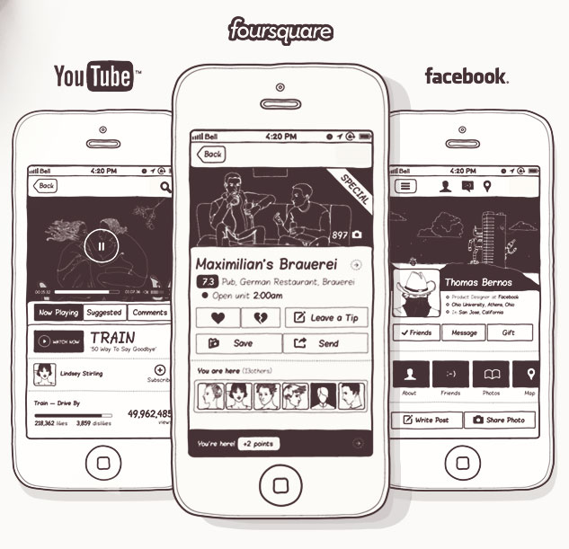 Unlike other UI kit, Basiliq using freehand design concept, so from design perspective, you don't have to worry misleading your client, everything is presented in informal hand drawn, sketches and wireframes. It's good to explain your concept and let your client know how each UI element are positioned and its function too. With over 300+ elements, all vector based, you can assemble anything from them. Here we have YouTube, foursquare and facebook:
