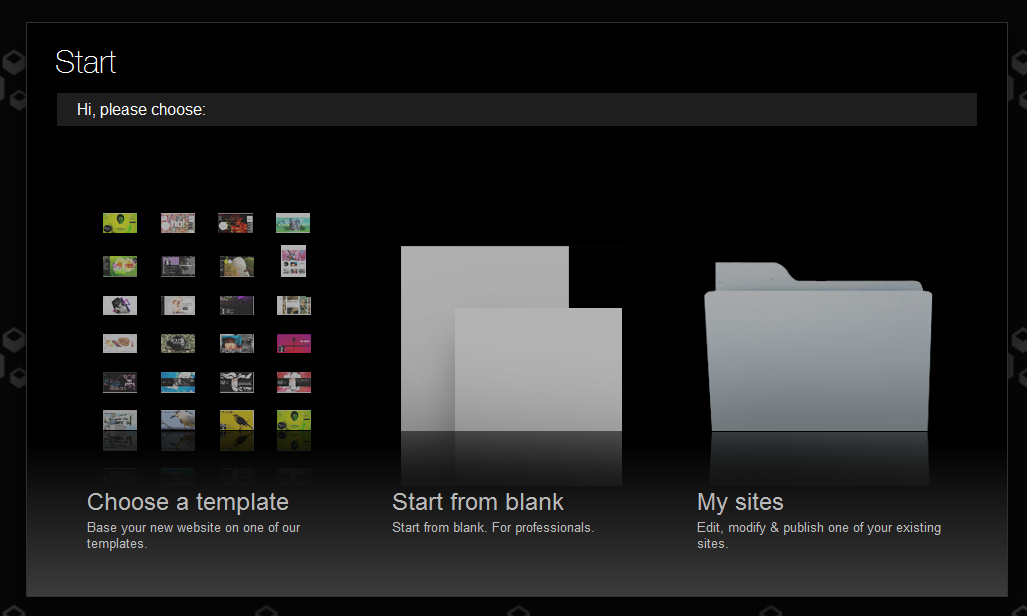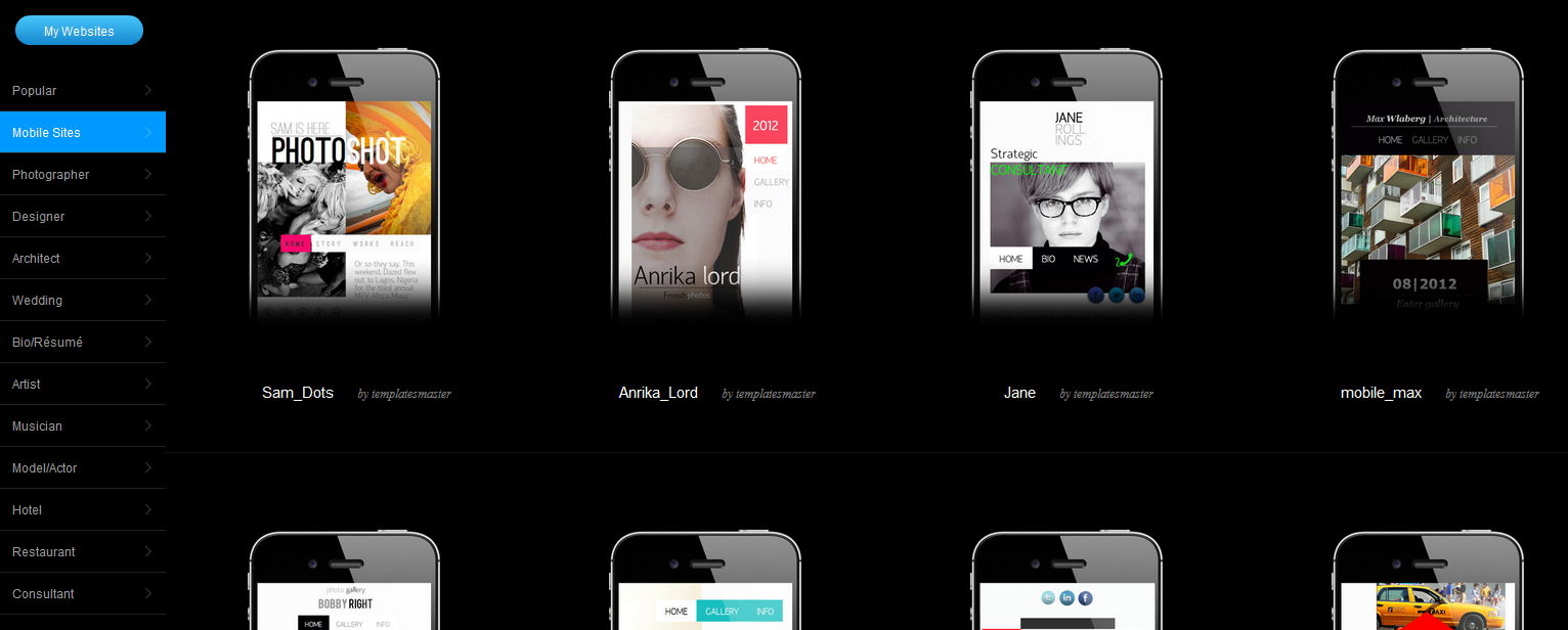 The start button doesn't lie, and it takes you straight to the matter, without mandatory registration at this point. You can choose to start from scratch, or use templates, which are from the most diverse domains: real estate, cooking, art, freelancing, events, etc. This is where you have the "mobile sites" category as well, which is so popular nowadays.