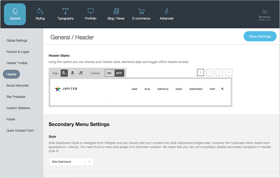 Once I fired it up I saw that also included in the theme price are several portfolio and blog styles, 128 content shortcodes, over 1600 icons, 10 custom post types, 14 custom widgets, 18 Header Styles, and 14 different WP Menu locations. Jupiter V5 is also designed to work with many popular WP plugins such as WPML, bbPress and Gravity forms.