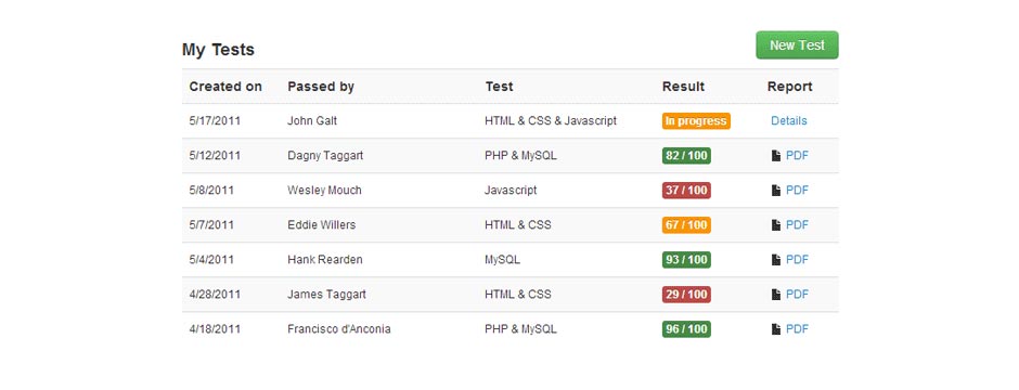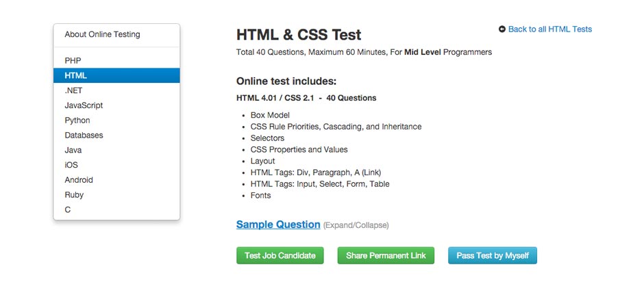 It's very easy to create a test, just click on "New Test" button and then choose a test from a few lists. For example, you can choose PHP quiz or combined PHP with other related subjects such as Javascript, MySQL, HTML and CSS. Each subject has at least 18 questions, and each question is carefully created to ensure it's of good quality. Here is an example of HTML & CSS test I created in less than a few seconds!