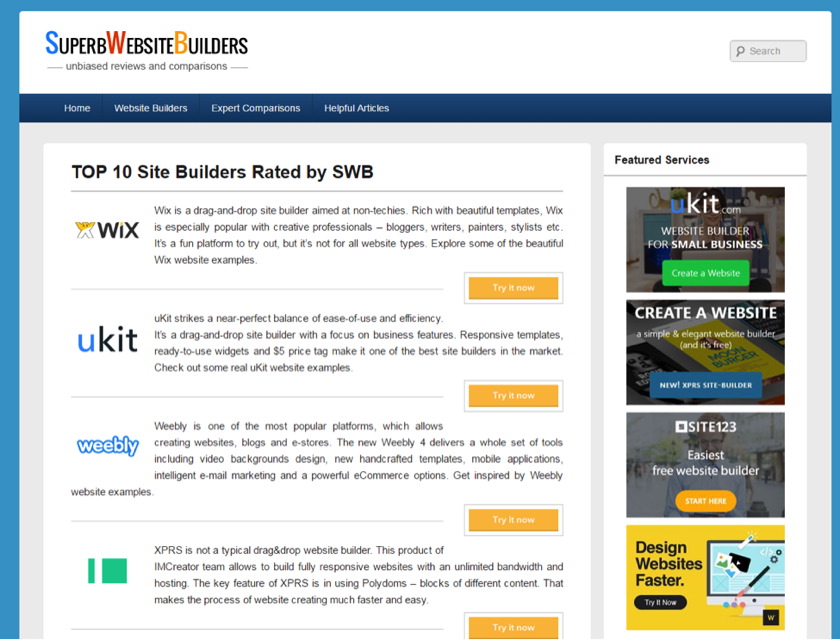 SuperbWebsiteBuilders is a place, where users may find trustworthy and informative reviews of the best website builders. There are interesting niche articles, ratings of website builders and their comparisons that enable the users to choose the site builders to meet their web building needs. What’s more, the website also publishes articles that cover niche-related information.