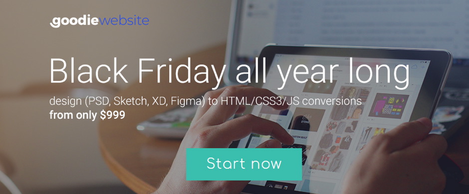 Jump online before the 2018 ends. Launch your website with Goodiewebsite.com. This unique platform allows you to work directly with a developer who will code your design within a few days and at the affordable price. At Goodiewebsite "Black Friday" last all year long as you can get a "design to code" conversion for $999.