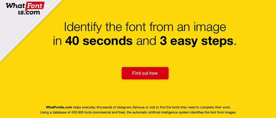 WhatFontIs helps everyday thousands of designers to find the fonts they need to complete their work. Using a database of 450,000 fonts (commercial and free), the automatic artificial intelligence system identifies the font from images. In less 40 seconds you will get 60 similar free and commercial fonts.