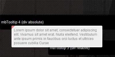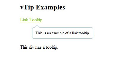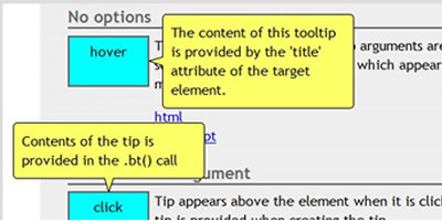 BeautyTips is a jQuery tooltips plugin which uses the canvas drawing element in the HTML5 spec to dynamically draw tooltips (sometimes called "talk bubbles" or "help balloons") associated with a html element on the page - vTip | demo